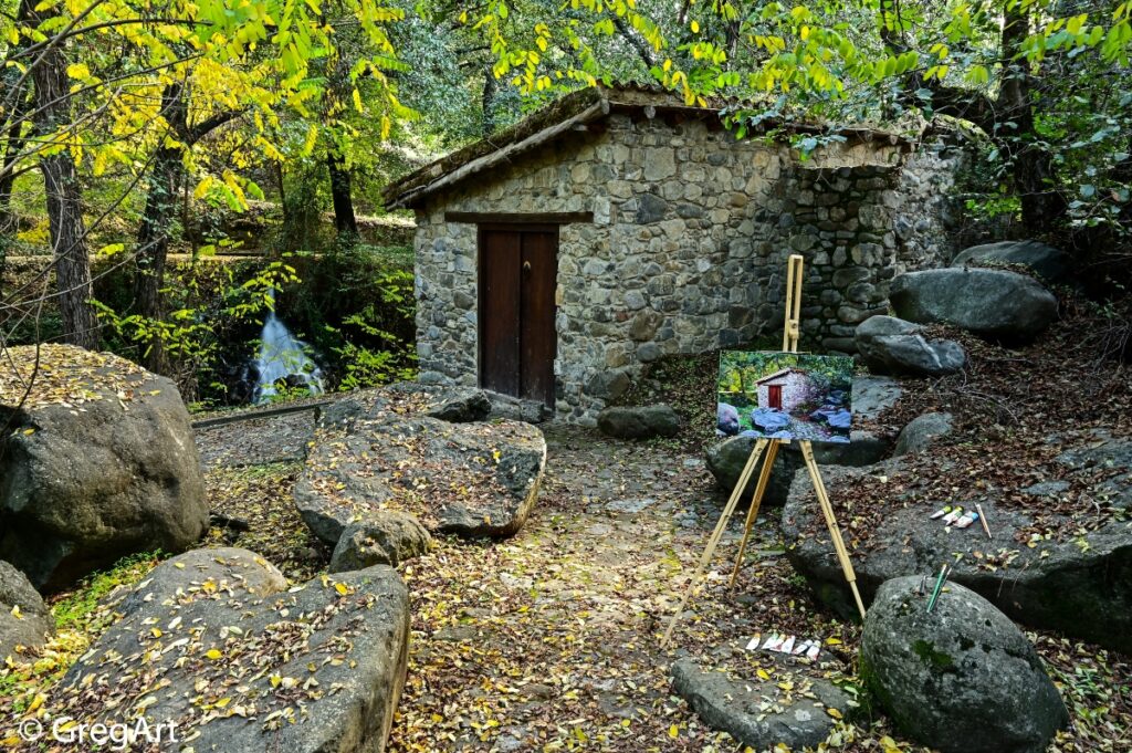 Τώρα βρισκόμαστε μπροστά στον ένα και μοναδικό, τον αναπαλαιωμένο νερόμυλο του Κύριλλου που την Γαλάταν, όπως τον λεει ο κόσμος. Οι άλλοι παρήκμασαν και παραμένουν βουβά σκέλεθρα σκόρπια στο χρόνο. Κατεβαίνουμε από εκεί ακόμη πιο κάτω και περνούμε ένα στενό και χαμηλό κοίλωμα τεράστιου και συμπαγούς βράχου. Είμαστε ακριβώς κάτω από τον μύλο, όπου και η μεγάλη φτερωτή του. Δίπλα υπάρχει μια κατακόρυφη πετρόκτιστη χωάνη, που αναφέραμε, ύψους 20 μέτρων που δεν φαίνεται παρά μόνο το κάτω στενό στόμιο της, το «σιφφούνιν» από όπου εξφενδονίζεται, εν ώρα λειτουργίας, με μεγάλη πίεση το νερό επάνω στις κούππες της φτερωτής και η τελευταία δίνει την κίνηση στο μύλο. Ανεβαίνουμε και μπαίνουμε από την είσοδο που είπαμε πιο πάνω, σε ένα ευρύχωρο σχετικά δωμάτιο όπου αντί να βρούμε ένα μύλο, βρήκαμε τρεις, ο ένας πλάι στον άλλο. Όπως μας εξήγησε ο ιδιοκτήτης ο ένας αλέθει σιτάρι, ο άλλος κριθάρι και ο τρίτος πουρκούρι. Εκείνη τη στιγμή ο μυλωνάς ξεκίνησε τον σιταρόμυλο. Άνοιξε εκεί δίπλα το «δείμμα του νερού» χρησιμοποιώντας ένα κάθετο μοχλό με χειρολαβή, δίνοντας του μια στροφή 45 μοιρών και τροφοδότησε την «αβάτζην» το χωνί, με ντόπιο σκληρό σιτάρι για να το αλέσει ο μύλος. Με το παρατεταμένο φλοίσβημα του τρεχάμενου νερού, διαποτίστηκε και ο εσωτερικός σωρός από τη λεπτή και ευχάριστη μυρωδιά του φρεσκοαλεσμένου ζεστού αλευριού. Δίπλα επάνω στη σταθερή και ακίνητη μυλόπετρα του κριθαρόμυλου, καθόταν ένας τεχνίτης που κτυπούσε συνέχεια και ρυθμικά με το «μυλοχαράϊν» (κοντό ατσάλινο σφυρί αμφιακιδωτό) για να χαράξει τα κανάλια πάνω στην σκληρή μυλόπετρα. Τα κανάλια πρέπει να χαραχθούν όλα στο ίδιο βάθος για να επιτυγχάνεται κανονική άλεση. Η μυλόπετρα παρ΄ όλον που αποτελείται από πολύ σκληρά κομμάτια πέτρας, είναι συμπαγής και προέρχεται από τη νήσο Μήλο. Τη σκληρότητα της την διακρίνουμε και από τις σπίθες που βγαίνουν από το μυλοχαράϊν που κτυπούσε επάνω της. Για αυτό τα "μυλοχαράϊα" παρόλο πού είναι καμωμένα από σκληρό ατσάλι, "κουτσώνονται" και πηγαινοέρχονται στον κωμοδρόμο πάνω από 30 φορές για να βαφτούν, να ακονισθούν. Μια ματιά γύρω ξεχωρίζουμε τα διάφορα εργαλεία και σύνεργα του μύλου: η αμπούστα (μέτρο χωρητικότητας, έντεκα οκάδες) το ζύγιν, οι οκάδες, τα μυλοχαράϊα, ανταλλακτικά των κούππων της φτερωτής, πίσσα ρετσίνα που επαλείφονται τα κολάνια για να συγκρατούνται πάνω στην τροχαλία, το περιβόητο «κκετσιέν» με το γράσο που ετοποθετούντο στους άξονες του μύλου για να περιορίσουν την μεγάλη τριβή, αφού δεν υπήρχαν ρουλεμάν και πολλά άλλα εργαλεία του παλιού καιρού που οι επισκέπτες τα βλέπουν επί τόπου.